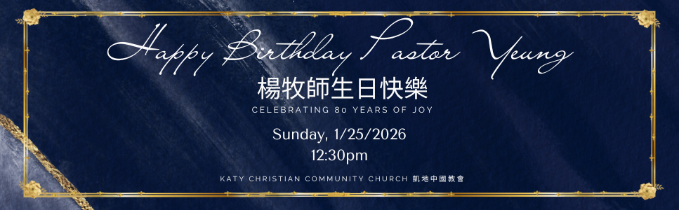 We will gather to celebrate Pastor Yeung's 80th Birthday on Sunday 1/25/26 starting at 12:30pm at church. To help us prepare for this celebration, please reserve your lunch in advance. The adult lunch is $5 per person and pizza is $1/slice. Payment is made when lunch is picked up.